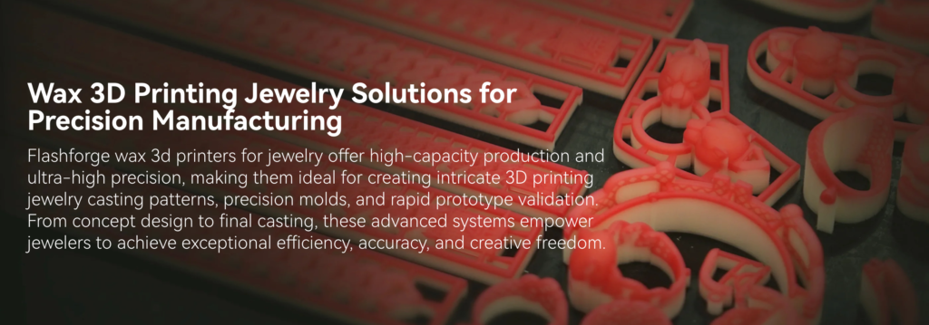 Wax 3D printers are mainly used in jewelry casting, dental applications, and precision investment casting, where extremely fine details and smooth surfaces are essential. For example, in jewelry making, printers like the Flashforge WaxJet series can produce high-precision wax models that are later used in the lost-wax casting process, allowing jewelers to create complex designs with clean burnout and minimal material waste.