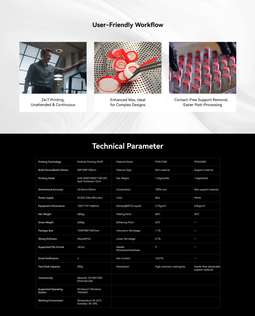 The Flashforge WaxJet 510 offers ultra-high resolution of 2900 × 2900 × 1700 DPI, with a minimum layer thickness of 15μm and dimensional accuracy of ±0.04mm/20mm.